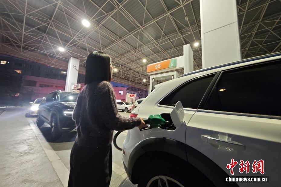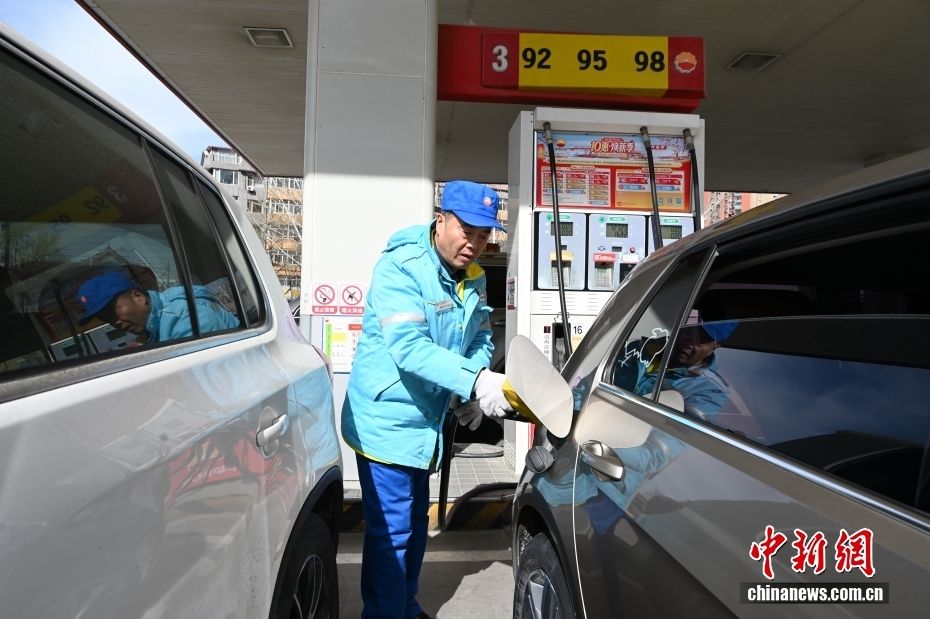 3月9日,江苏南京一家加油站的工作人员给车辆加油。