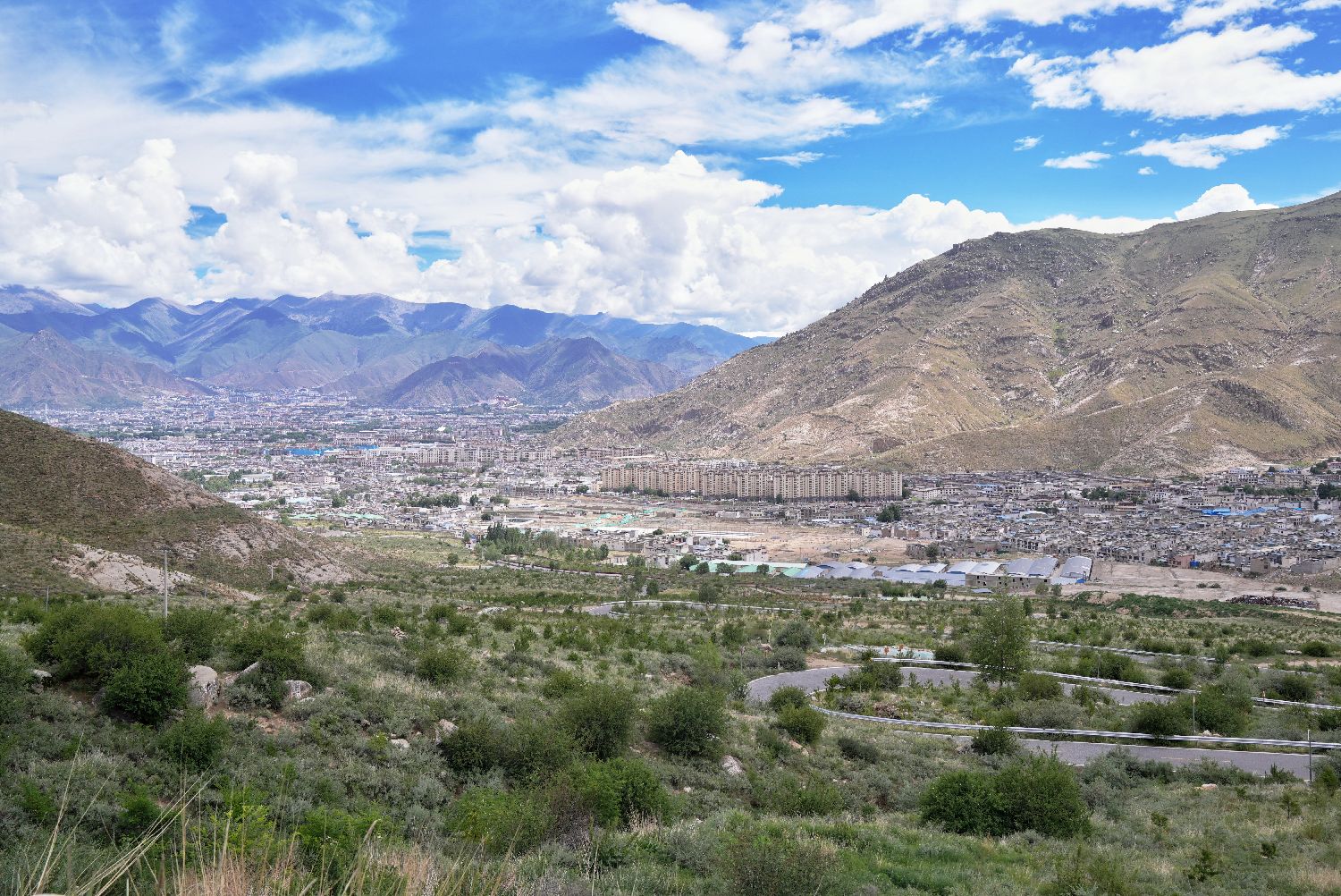 2025年7月16日,从西藏拉萨娘热沟俯瞰,南北山的绿色植被环抱拉萨城区。(图片来源:中新社)