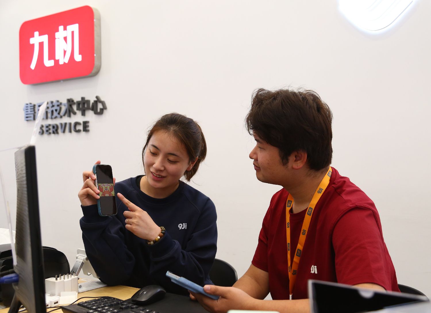 3月11日,在云南省腾冲市一手机专卖店内,工作人员在和同伴交流开源AI智能体“龙虾”的操作体验。(图片来源:本文图片均据新华社)