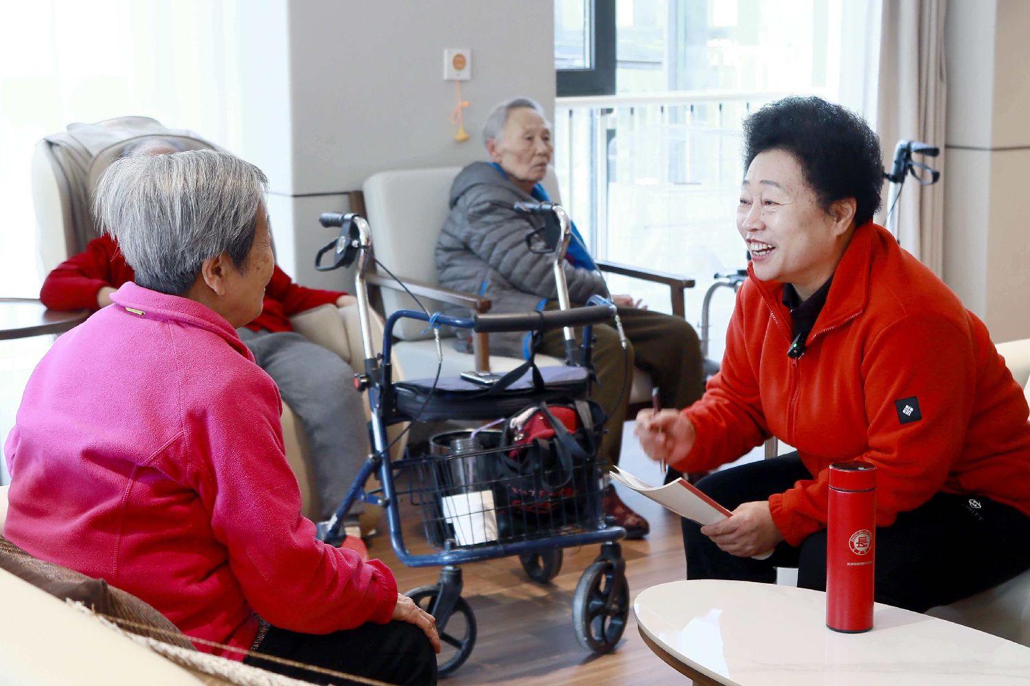 2025年1月,卓长立(右)走进社区和养老机构调研,了解老年人所想所需。(图片来源:中新社)