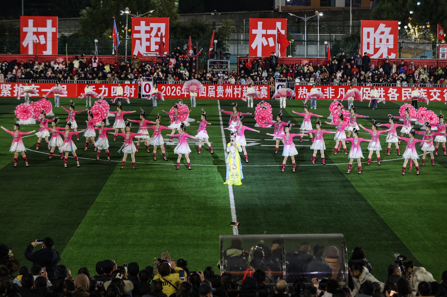 2026年1月2日,第四届贵州村超联赛开幕式暨村超村晚上的侗族歌舞表演。(图片来源:中新社)