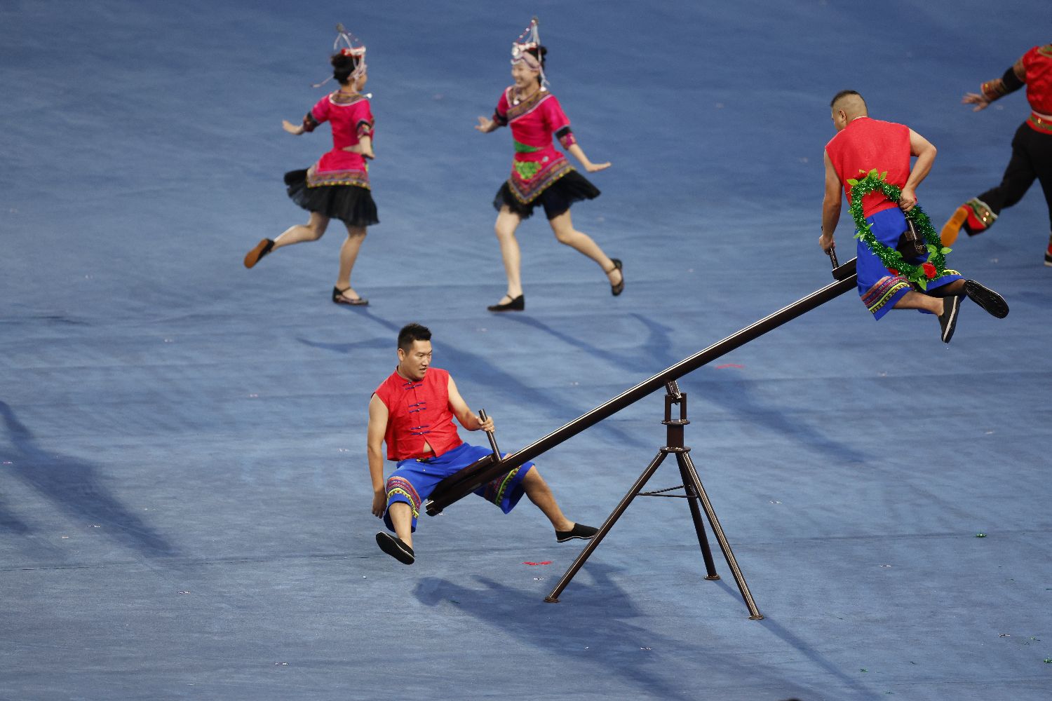 2023年9月23日,在杭州亚运会开幕式仪式前表演中,畲族传统体育项目《稳凳和摇锅》登上舞台。(图片来源:中新社)