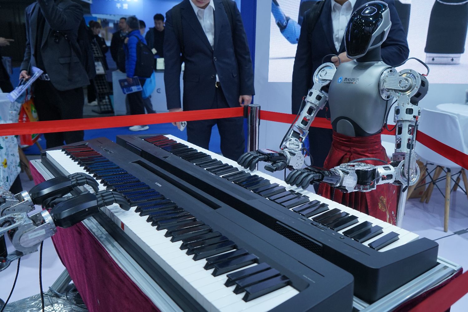 3月11日,第三届中国具身智能机器人产业大会暨展览会在杭州开幕。图为展会上人形机器人表演弹奏钢琴。(图片来源:中新社)