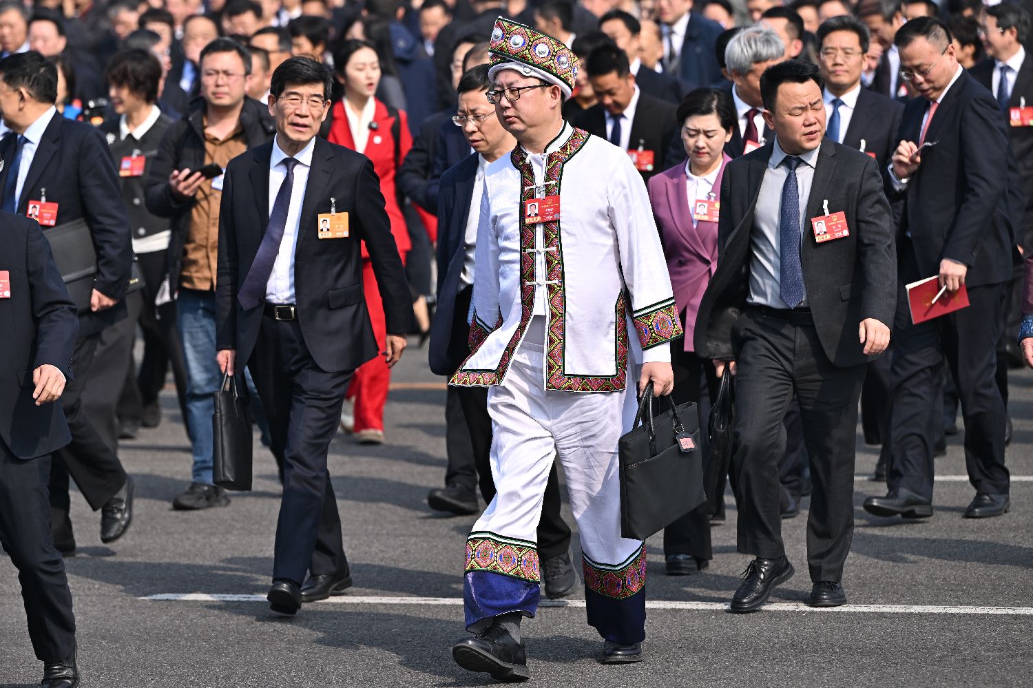 3月12日,人大代表们手提公文包,参加十四届中国全国人大四次会议闭幕会。(图片来源:中新社)