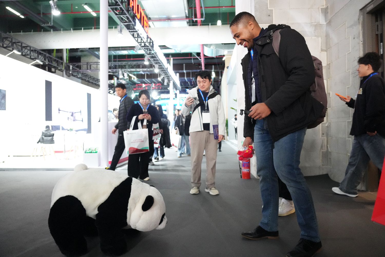 憨态可掬的机器熊猫与现场外国观众趣味互动。