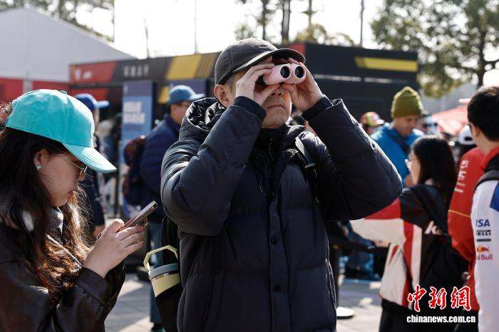 3月14日,车迷在上海国际赛车场水景广场用望远镜观看车手见面会。