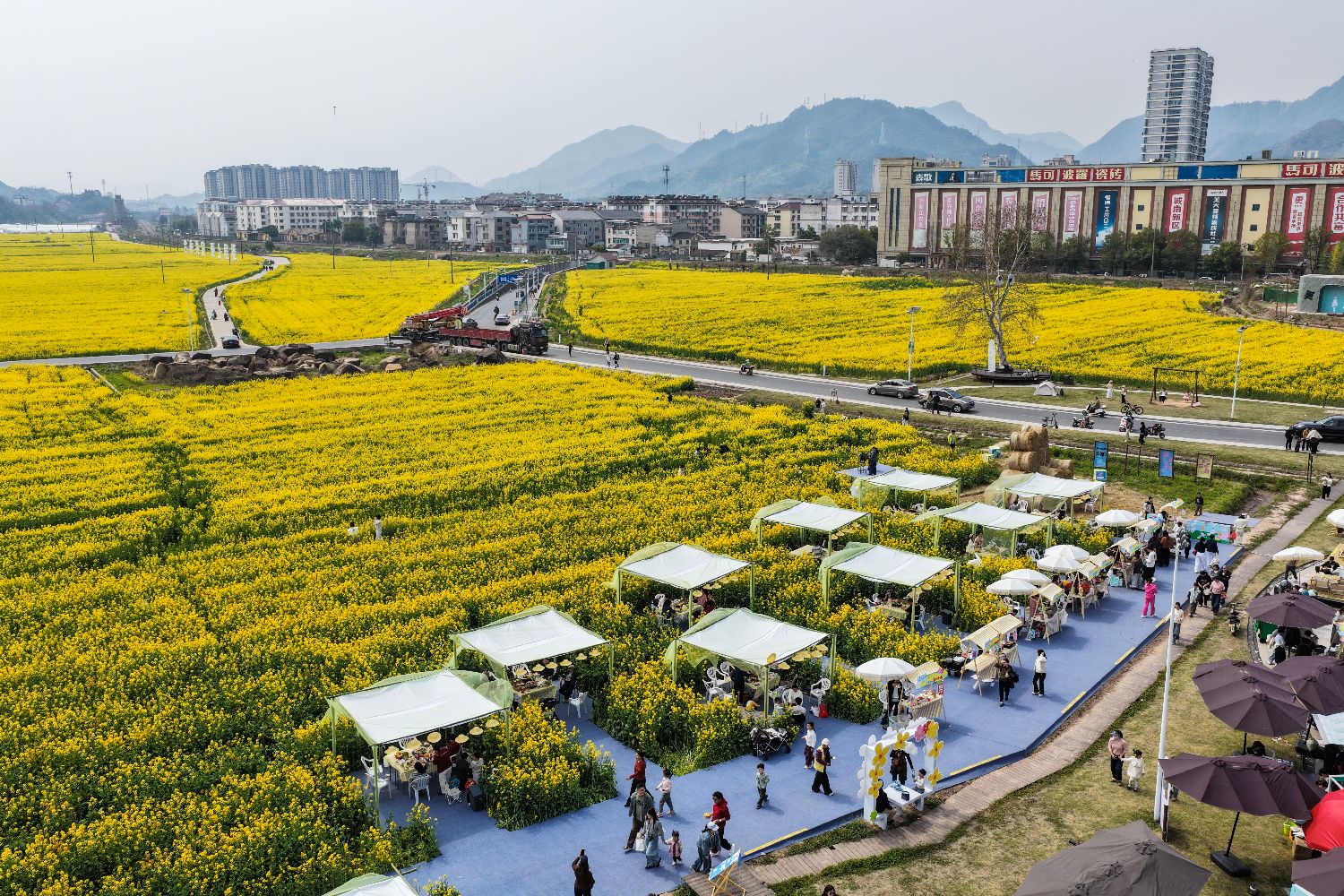 3月15日,建德市更楼街道城南城市田园油菜花田边的消费市集吸引了众游客(无人机照片)。