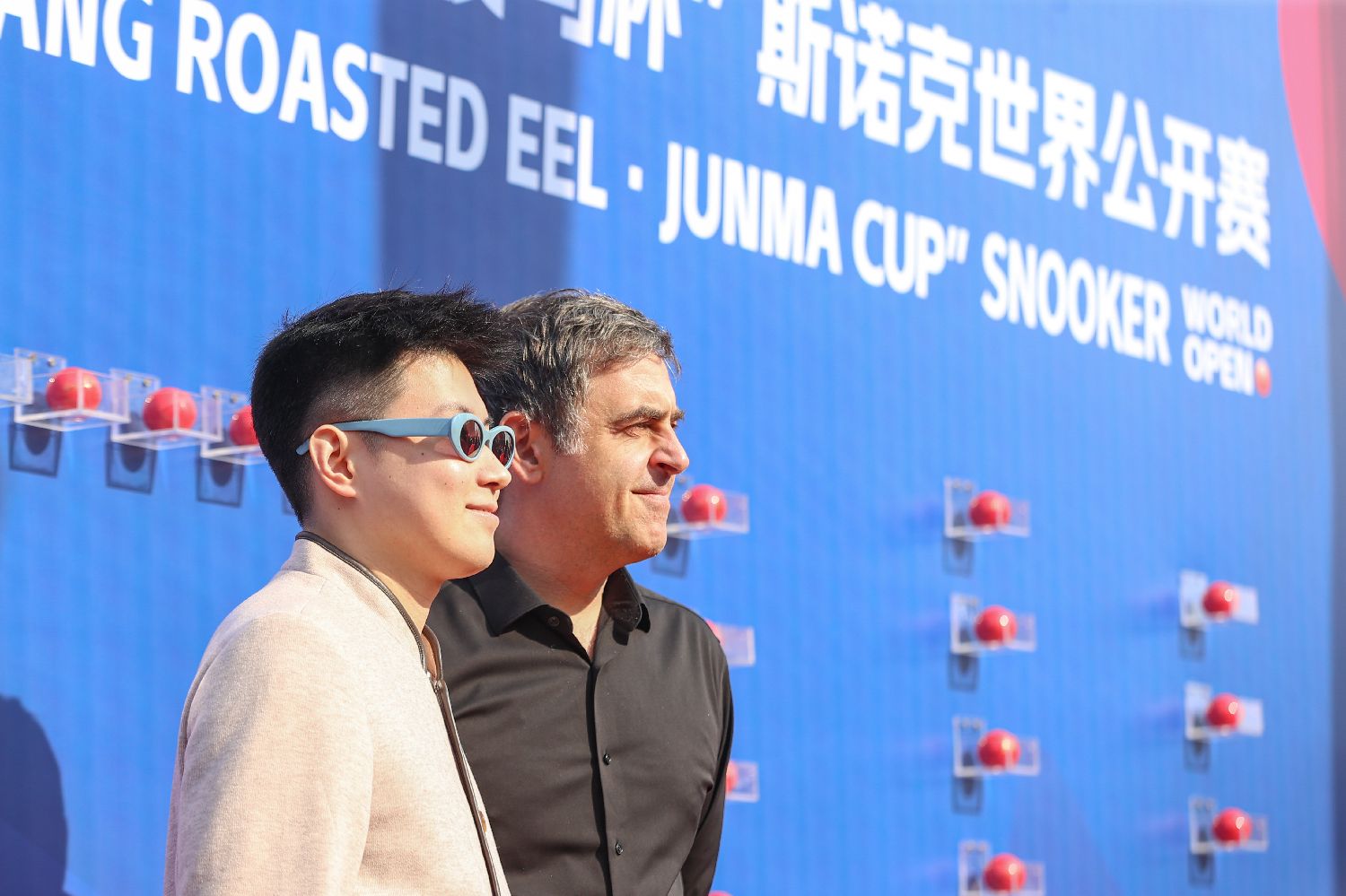 3月15日,中国首位斯诺克世锦赛冠军赵心童(左)与英格兰名将奥沙利文在江西玉山亮相2026斯诺克世界公开赛红毯仪式。(图片来源:中新社)
