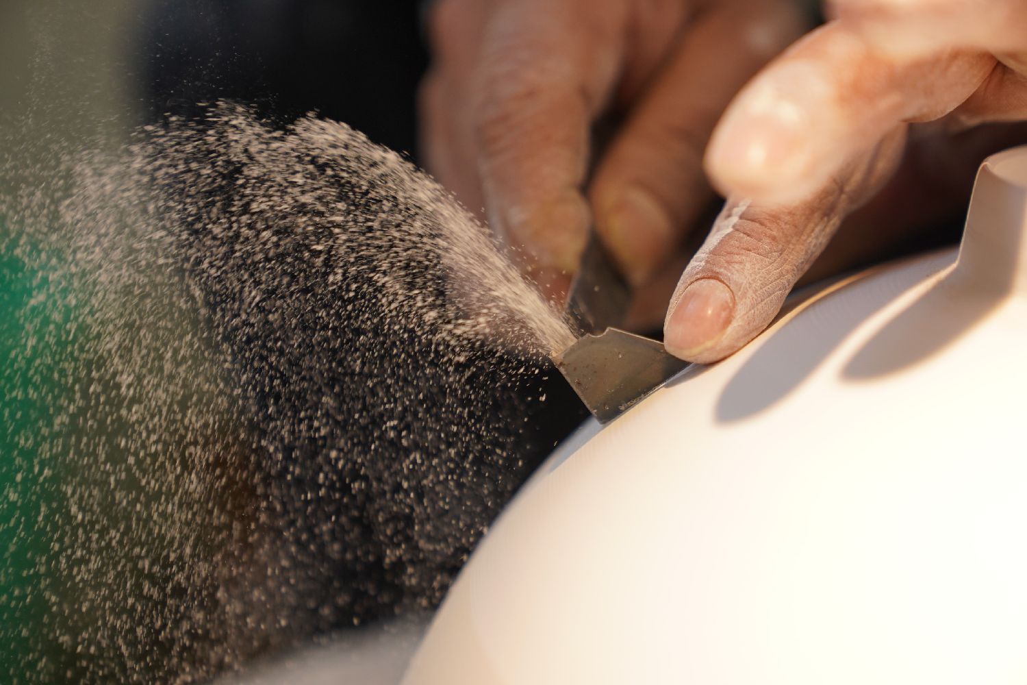 薄胎瓷的制作工序繁复,要经过四十多道手工工序,其中最关键的是“利坯”。匠人先将两三毫米厚的泥坯放在利坯台上,然后用特制的刀具,把坯体削薄至1毫米左右,犹如蛋壳一般。接着入窑烧制,烧成温度需根据器型精准控制在1280℃至1320℃之间。图为卢建德在进行“利坯”工序(3月10日摄)。(图片来源:本文图片均据新华社)