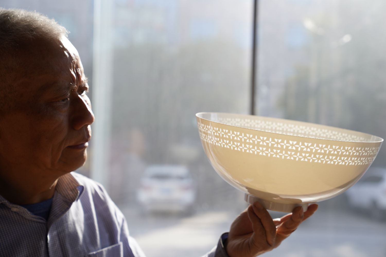 1980年,20岁的卢建德开始学习薄胎瓷技艺。四十多年来,经过对配料、利坯、窑温的不断摸索,卢建德制作薄胎瓷的成品率由最初的1%,提升到现在的30%到40%,但他还在探索手工技艺的极限。“我是个手艺人,痴迷陶瓷,作品能得到大家的喜欢,是我创作的动力。”卢建德说。图为卢建德制作的薄胎瓷碗(3月10日摄)。