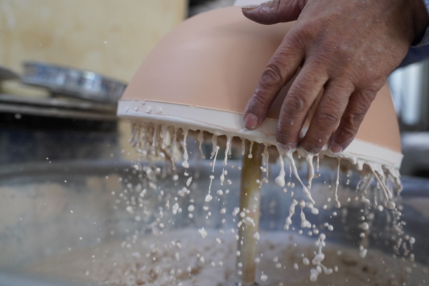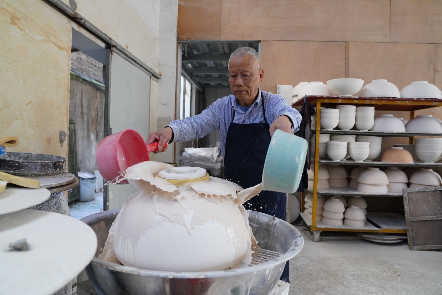 卢建德在给薄胎瓷碗上釉(3月10日摄)。