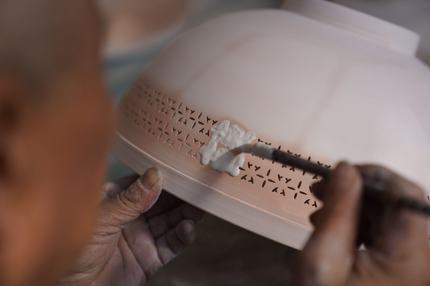 卢建德在给薄胎瓷碗进行“填釉”工序(3月10日摄)。
