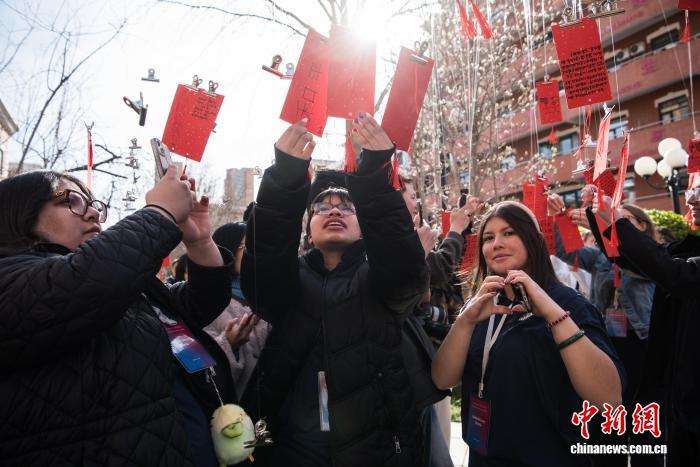 图为美国艾奥瓦州青少年“友谊传承”研学团成员将心愿卡片挂在象征友谊的银杏树上。