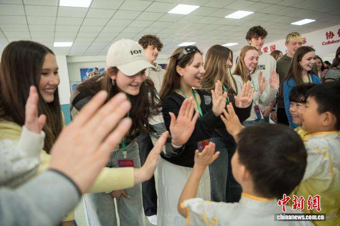 图为美国艾奥瓦州青少年“友谊传承”研学团成员与中国学生交流互动。
