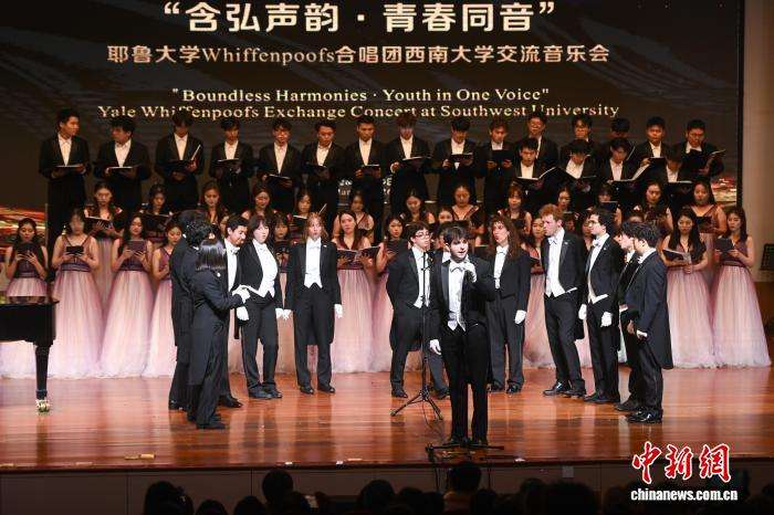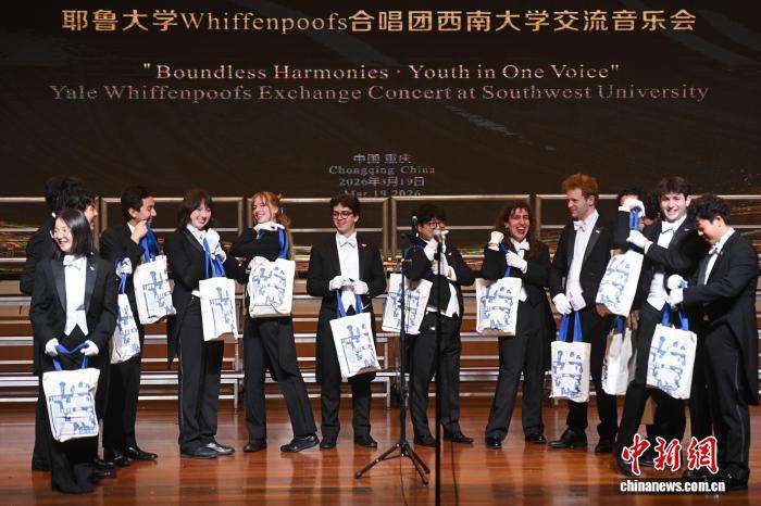 3月19日,美国耶鲁大学Whiffenpoofs合唱团走进位于重庆市的西南大学,与该校音乐学院合唱团、交响乐团联袂献艺,以歌声架起中美青年文化交流桥梁。当日,由北京大鸾翔宇慈善基金会邀请的“大鸾和鸣—耶鲁大学Whiffenpoofs合唱团2026中国公益行”正式启动,首站走进重庆。
