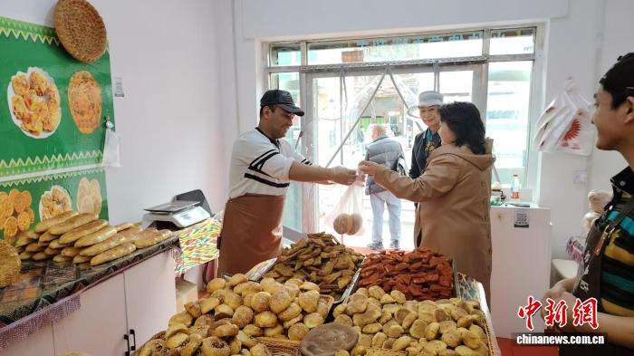阿卜杜拉给顾客递馕。(图片来源:中新网)