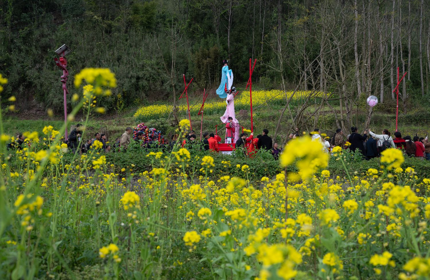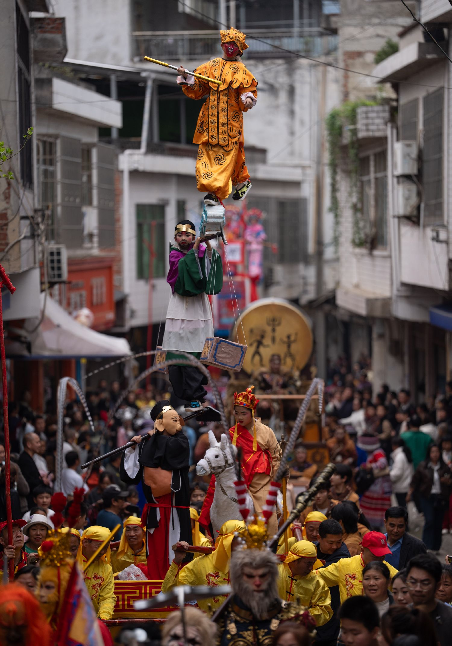 3月21日,四川省兴文县大坝苗族乡晏州社区,演员在巡游活动中表演大坝高装《西游记》。