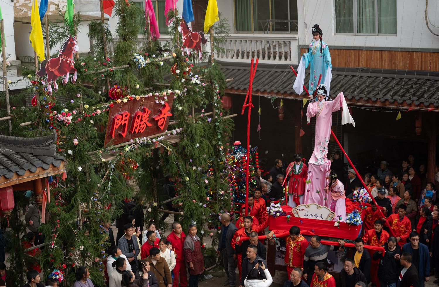 3月20日,四川省兴文县九丝城镇建武村,演员在巡游活动中表演木台铁桩戏《山伯访友》。