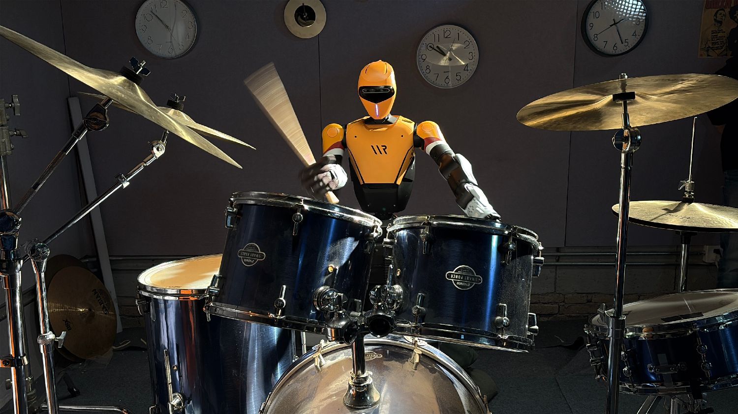 3月23日,搭载全球首个GAE身外化身系统的人形机器人“Titan o1(泰坦o1)”在杭州发布。图为“Titan o1”此前表演打架子鼓。(图片来源:中新社)