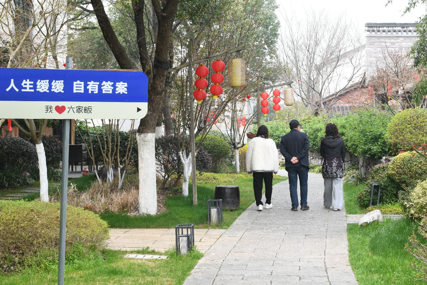 3月19日,游客在六家畈文旅小镇散步。(图片来源:中新社)