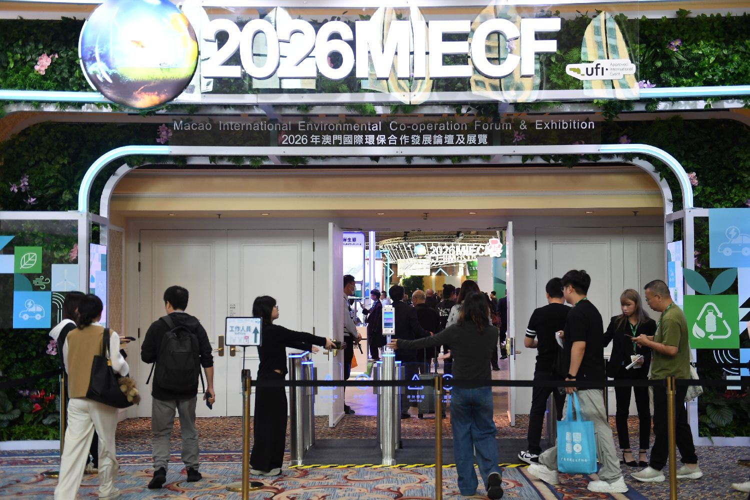 3月26日,澳门特区政府主办的“2026年澳门国际环保合作发展论坛及展览”在澳门金光会展中心开幕。图为现场人士参观展览。(图片来源:中新社)