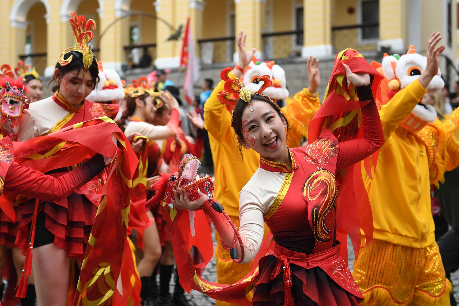 中新社报道,3月29日15时整,随着主持人倒数结束,近1600名身着各式服装的表演者从澳门大三巴牌坊前陆续出发,载歌载舞走进围观的“人海”中,沿着卖草地街、板樟堂前地一路向议事亭前地行进。