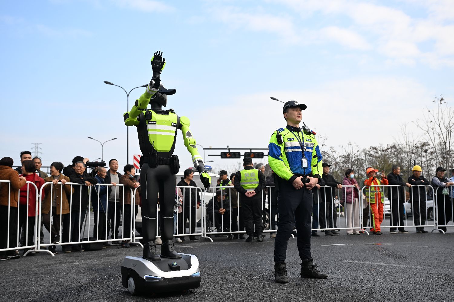 3月29日,AI交通管理机器人(左)在交警旁边引导马拉松跑者。(图片来源:本文图片均据中新社)