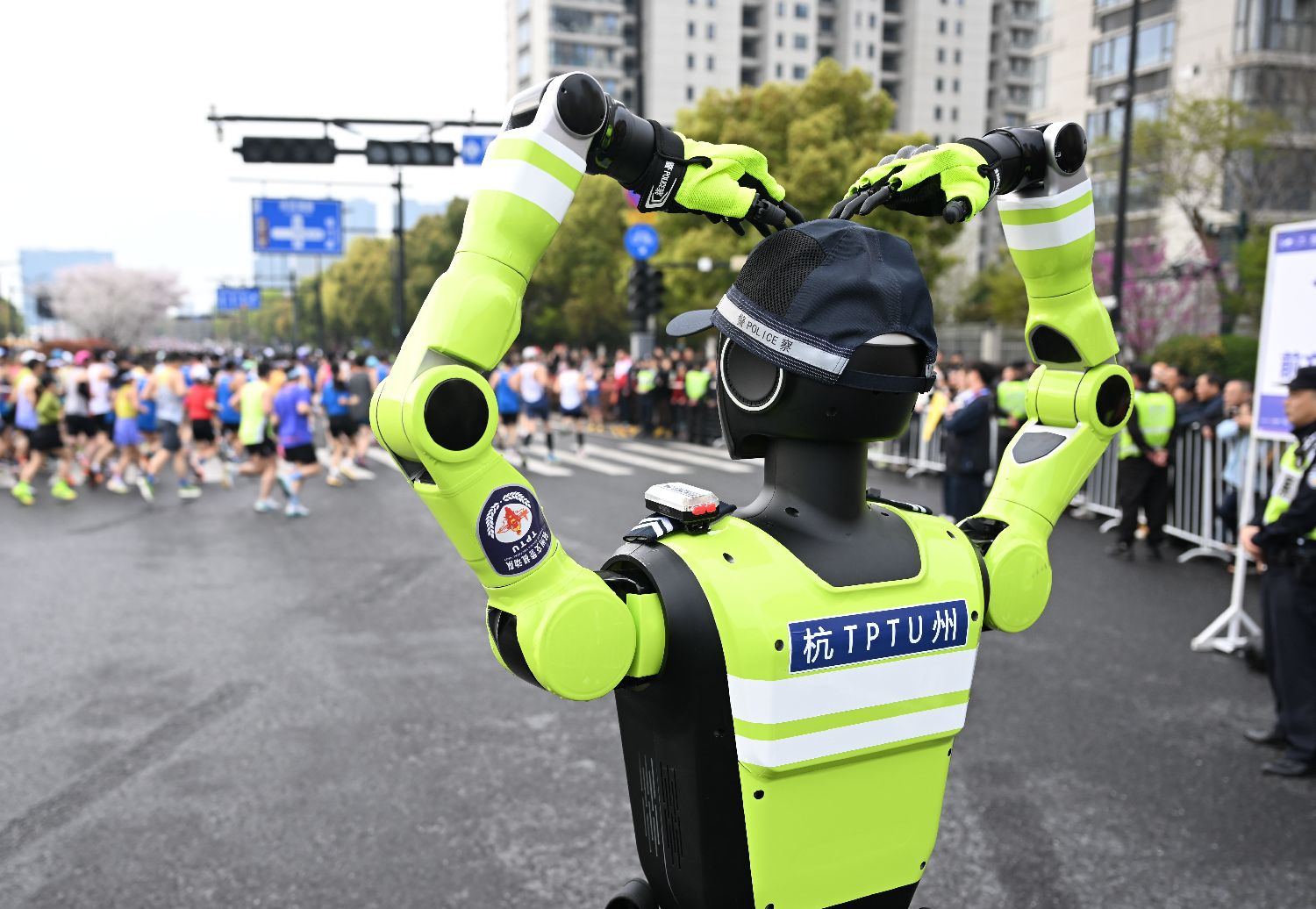 3月29日,AI交通管理机器人向马拉松跑者作出“比心”动作。