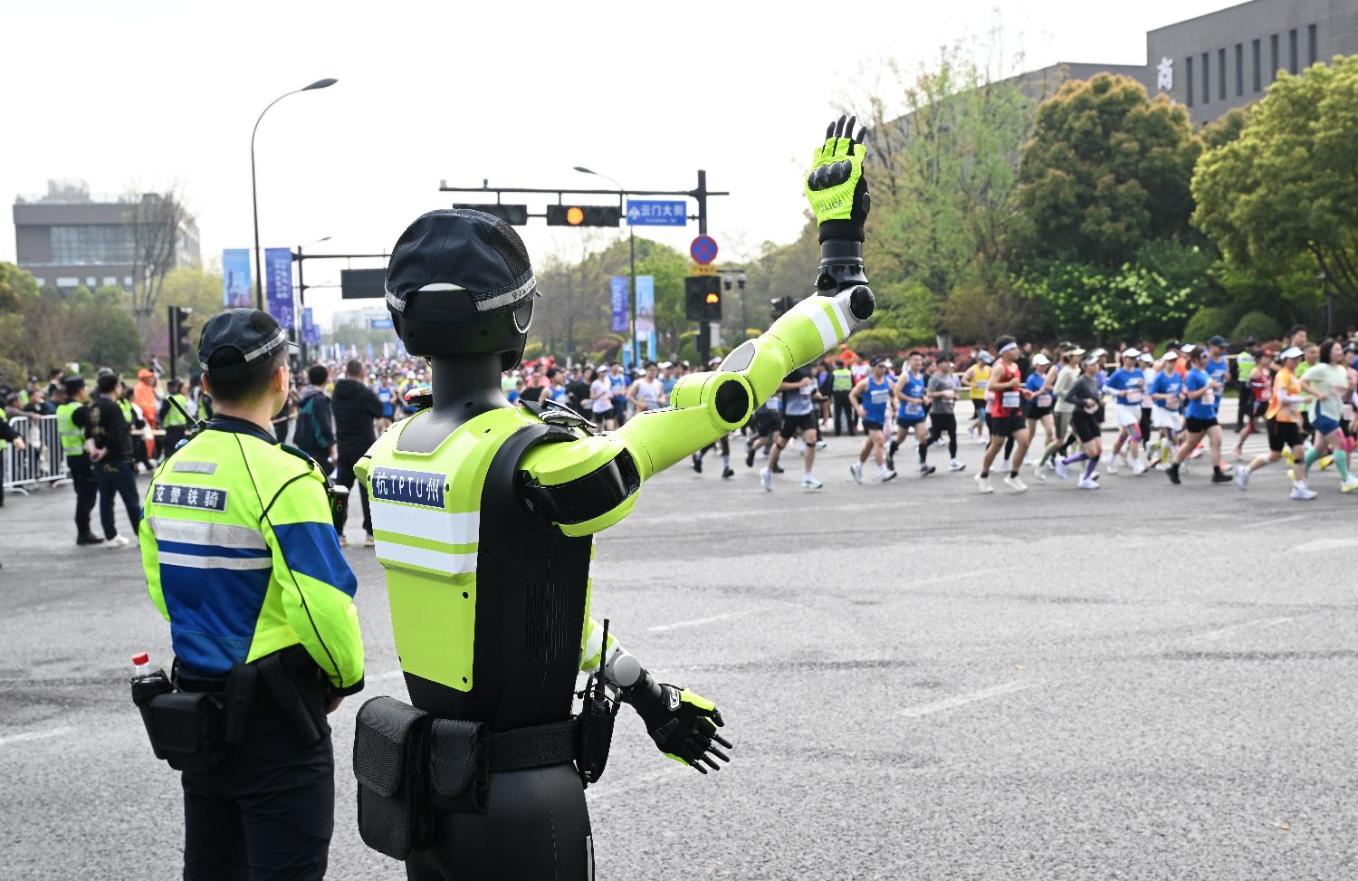 3月29日,AI交通管理机器人(右)在交警旁边引导马拉松跑者。
