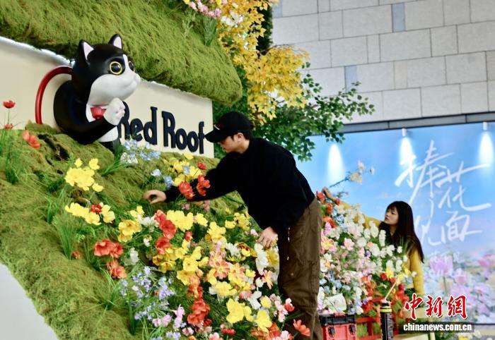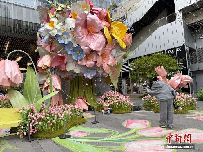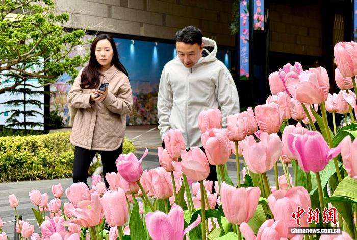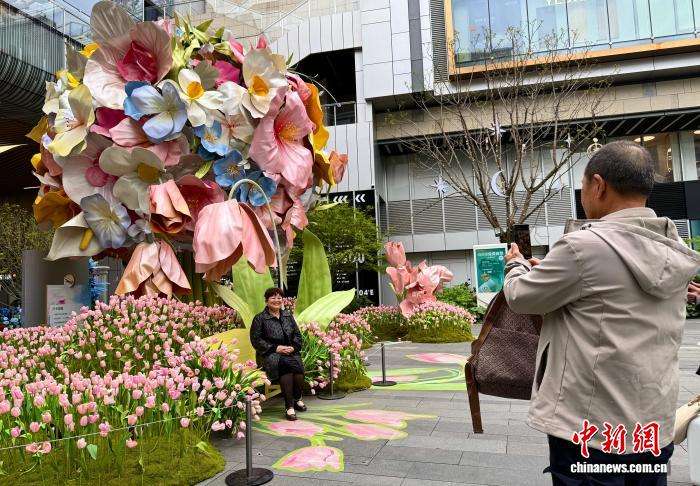 3月30日,四川成都一组名为“捧花见面”的巨型仿真花艺术装置吸引不少市民驻足欣赏、拍照留念。艺术装置以巨型仿真花束为主体造型,四周环绕仿真郁金香花海,地面搭配郁金香主题彩绘装饰,营造出浪漫的春日花境氛围。