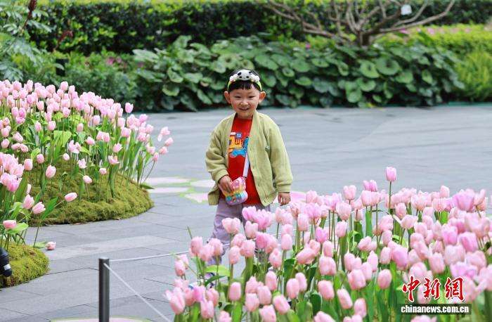 图为小朋友在粉色仿真郁金香花海中玩耍。