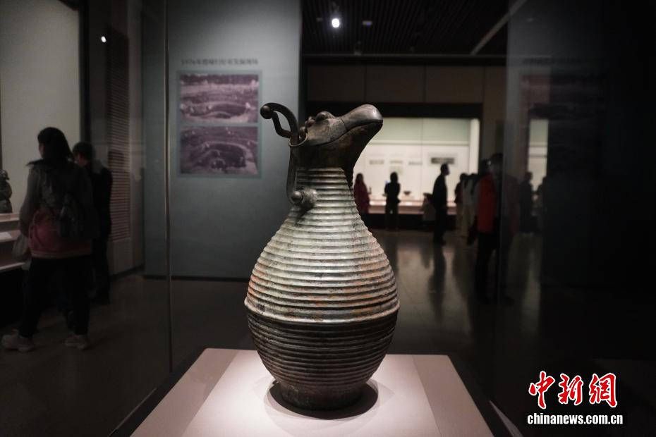 展出的青铜器鹰首形盖提梁壶。