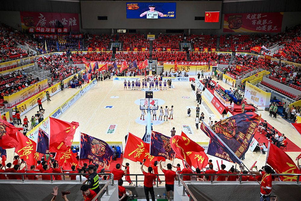 3月29日晚,2026年广东省城市篮球联赛(粤BA)第二轮赛事,广州队(白衣)与云浮队(紫衣)的比赛在广州天河体育中心举行。(图片来源:中新社)