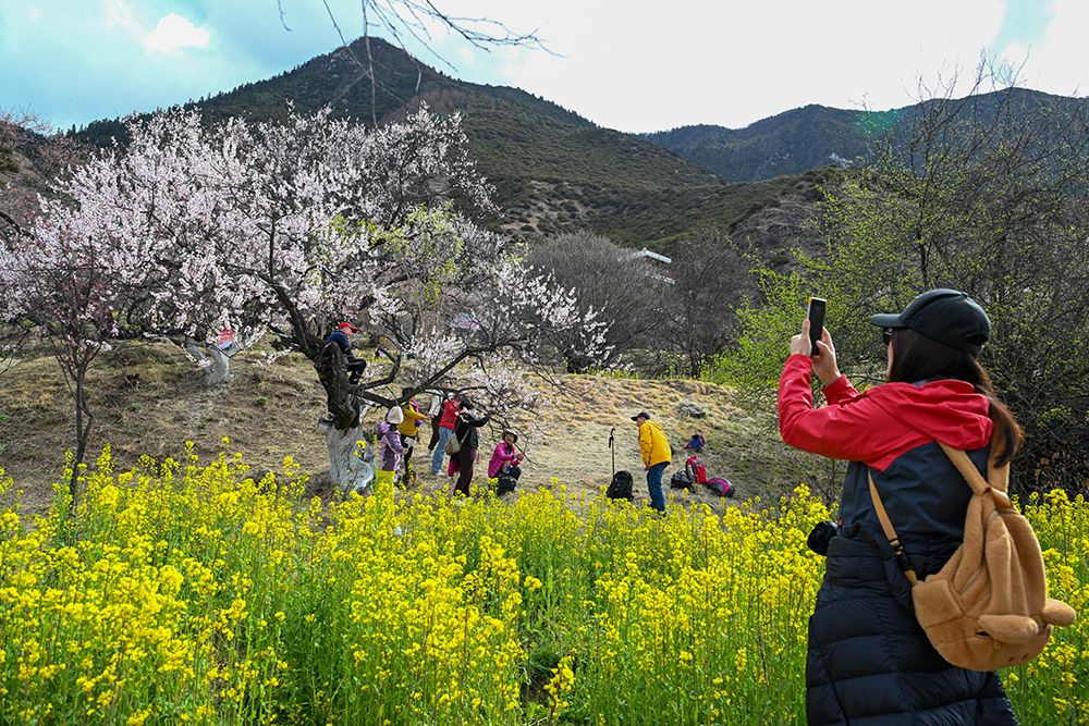 4月3日,游客在嘎拉村拍照留念。西藏林芝市嘎拉村被誉为“林芝桃花第一村”,是林芝市最佳的赏花地之一。(图片来源:中新社)
