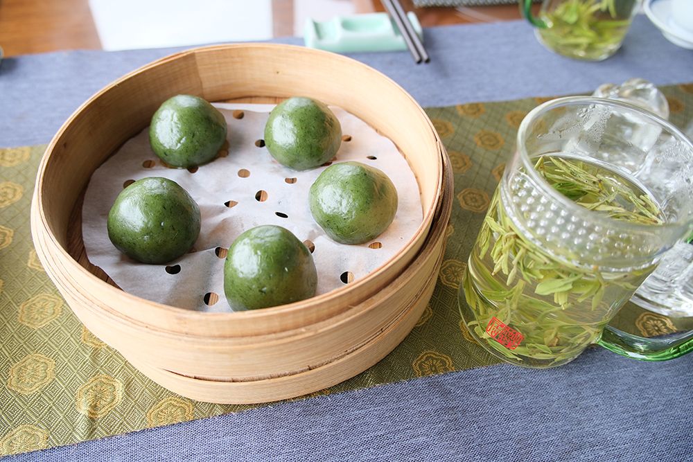 清明将至,蒸制后的青团油绿如玉,佐以明前西湖龙井,尽显江南清明食俗之美。(图片来源:中新社)