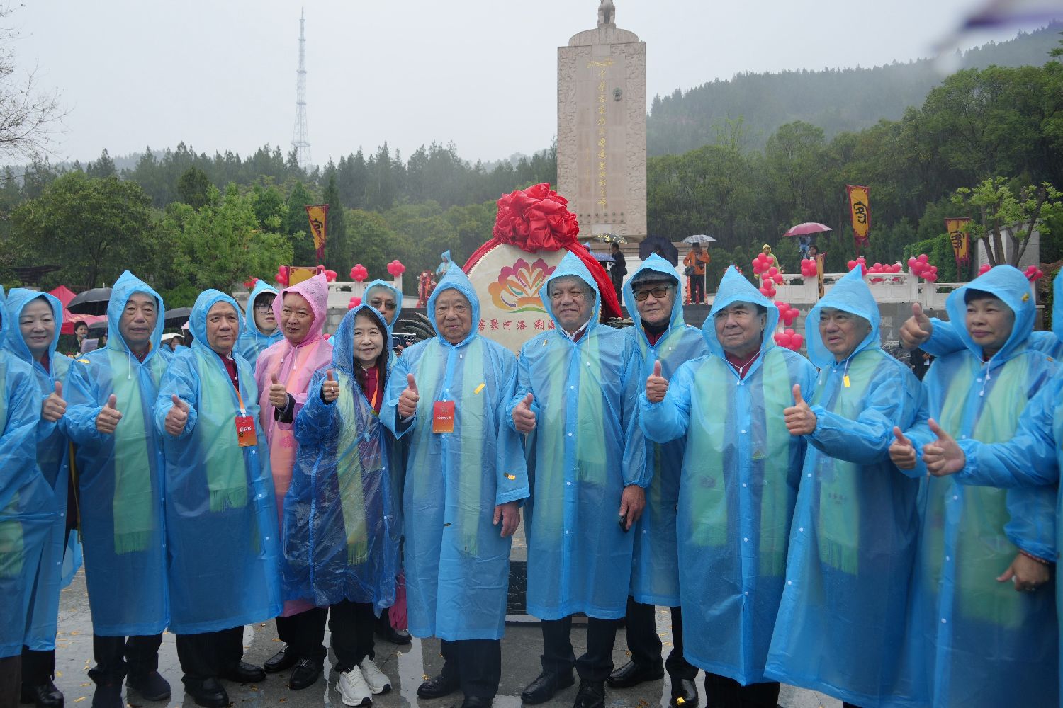 客家宗亲代表在中原客家先民南迁圣地纪念碑前拍照留念。(图片来源:中新社)