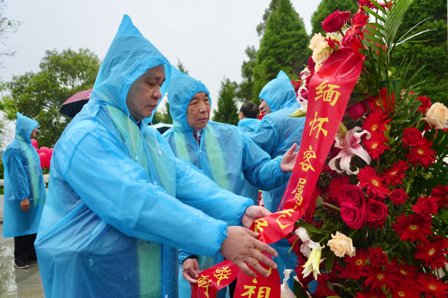 客家宗亲代表向中原客家先民南迁圣地纪念碑敬献花篮。(图片来源:中新社)