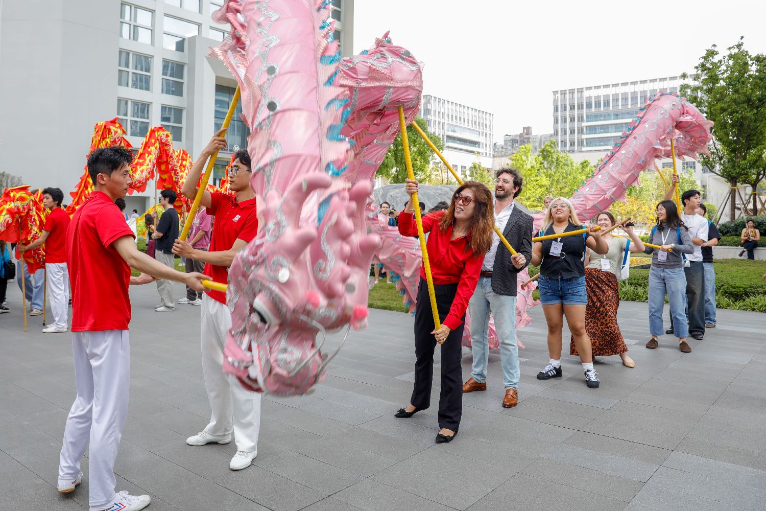 活动现场设置罗氏扎染、沙磁乱针绣、剪纸、羽毛毽、捶丸等体验项目,尤其是气势磅礴的铜梁龙舞吸引不少美国青年体验。大家排起长队,每人手持一根舞龙木柄,在教练的指导下,尝试模仿“八字舞龙”等动作。