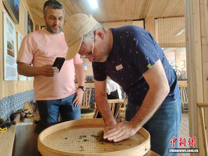 图为外国游客在广西桂林市阳朔县七仙峰茶场体验茶叶制作。(图片来源:本文图片均据中新网)