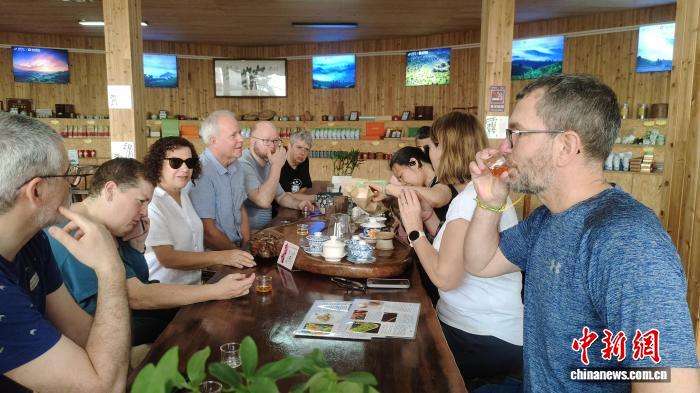 图为外国游客在品茶。