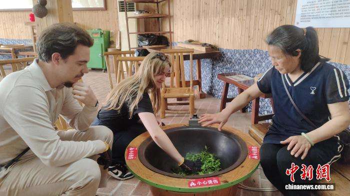 图为外国游客在广西桂林市阳朔县七仙峰茶场体验炒茶。