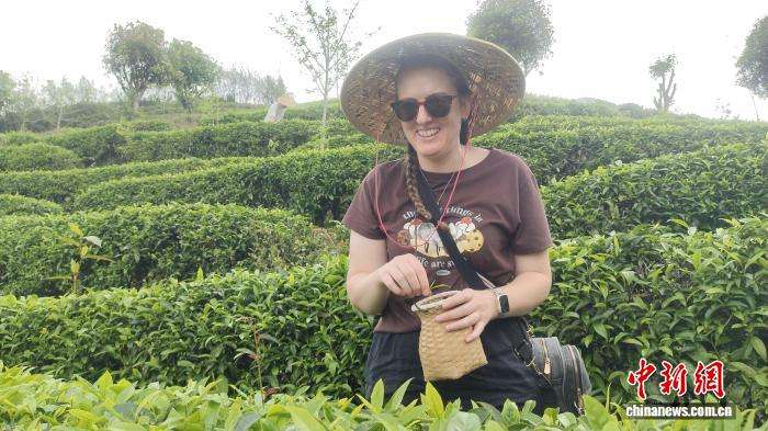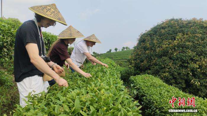 4月9日,10多名英国和澳大利亚的游客来到广西桂林市阳朔县七仙峰茶场,在碧绿的盘山茶垄间,在茶农的示范引导下采摘春茶“一芽一叶”,沉浸式体验采茶、炒茶、品茶全过程,感受中国传统茶文化。