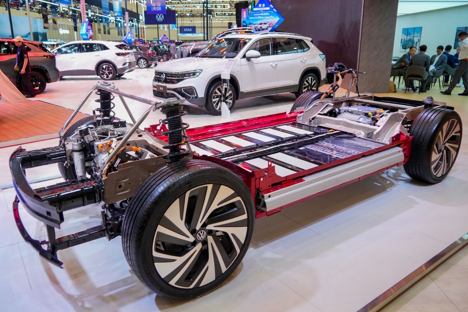 车展现场展示的一款新能源汽车底盘。(图片来源:中新社)