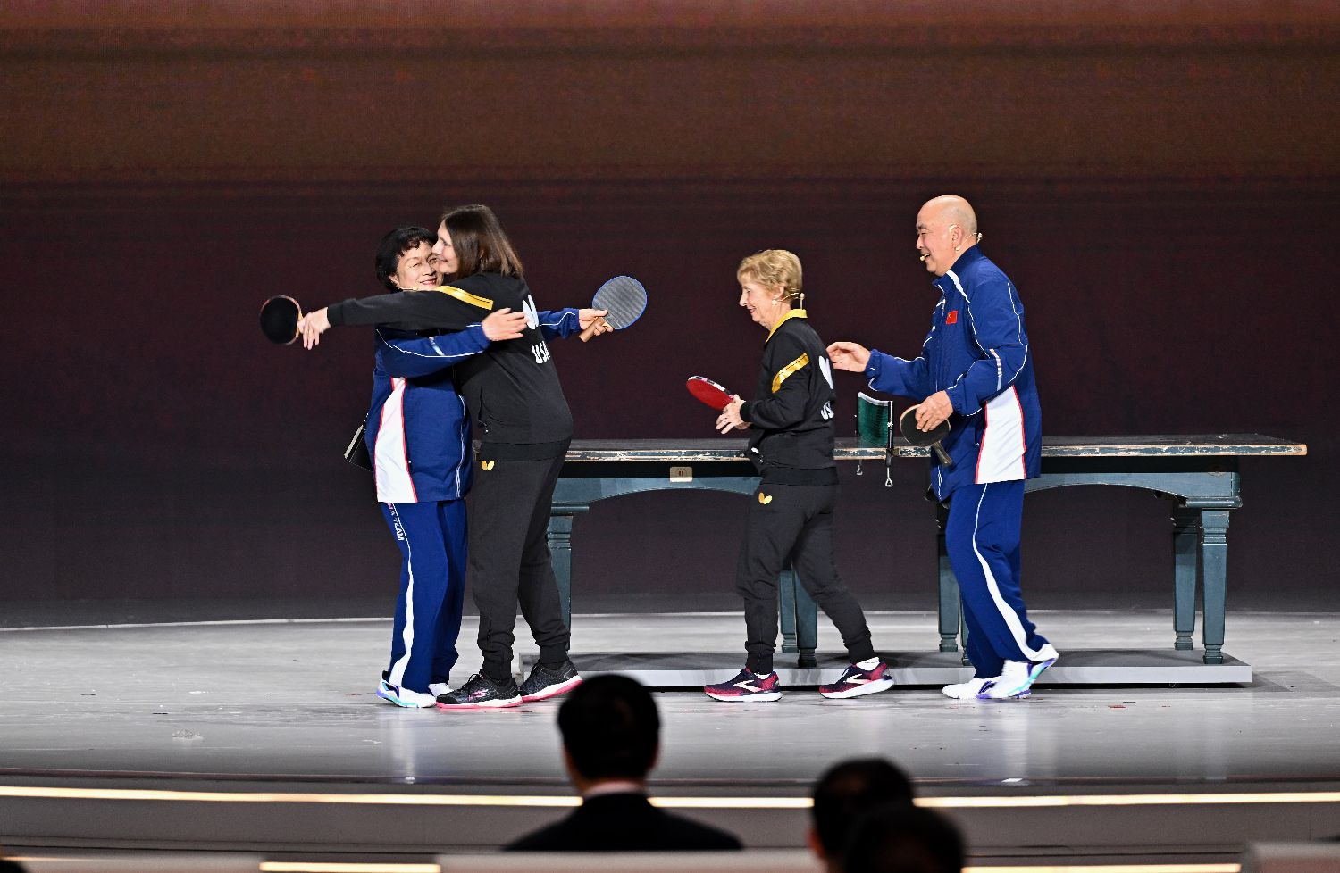“友谊第一,比赛第二。”四人用中英文说道。灯光聚焦球台,四位老将拿起球拍,展开一场别开生面的友谊赛。中美运动员两两搭档,对拉18个回合后,银球落地。他们相视而笑,相互握手,紧紧拥抱。