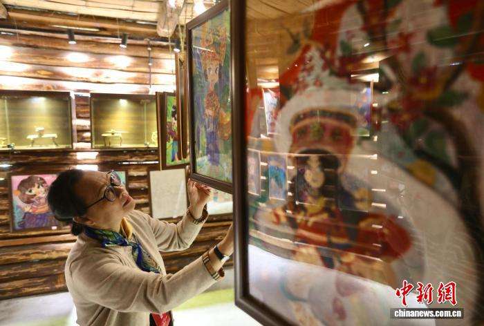 4月10日,一位海外华文媒体代表观看具有傈僳族元素的绘画作品。(图片来源:本文图片均据中新网)