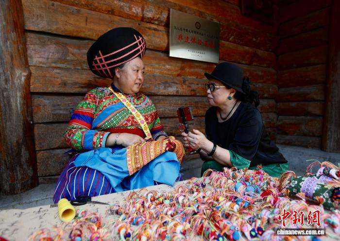 4月10日,四川省级非物质文化遗产傈僳族服饰制作技艺代表性项目传承人贺正芬(左)为海外华文媒体代表介绍傈僳族服饰的特点。
