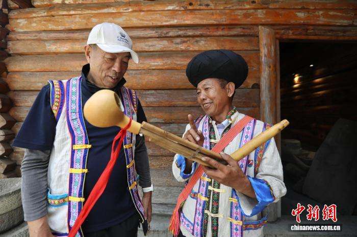 4月10日,传习中心葫芦笙传授老师贺银清(右)为海外华文媒体代表介绍葫芦笙的吹奏方法。