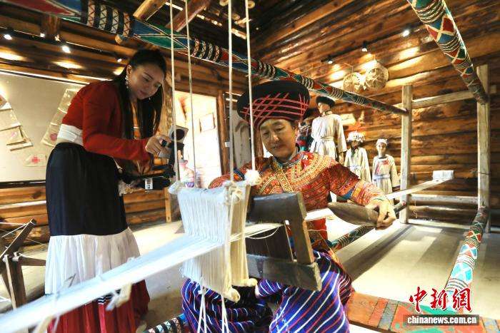 4月10日,一位海外华文媒体代表(左)拍摄视频记录傈僳族传统织布技艺。