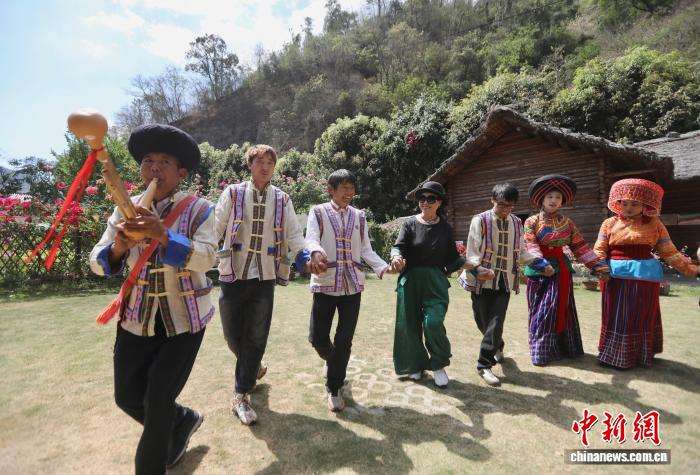 4月10日,一位海外华文媒体代表(左四)和传习中心工作人员跳起傈僳族笮山锅庄。