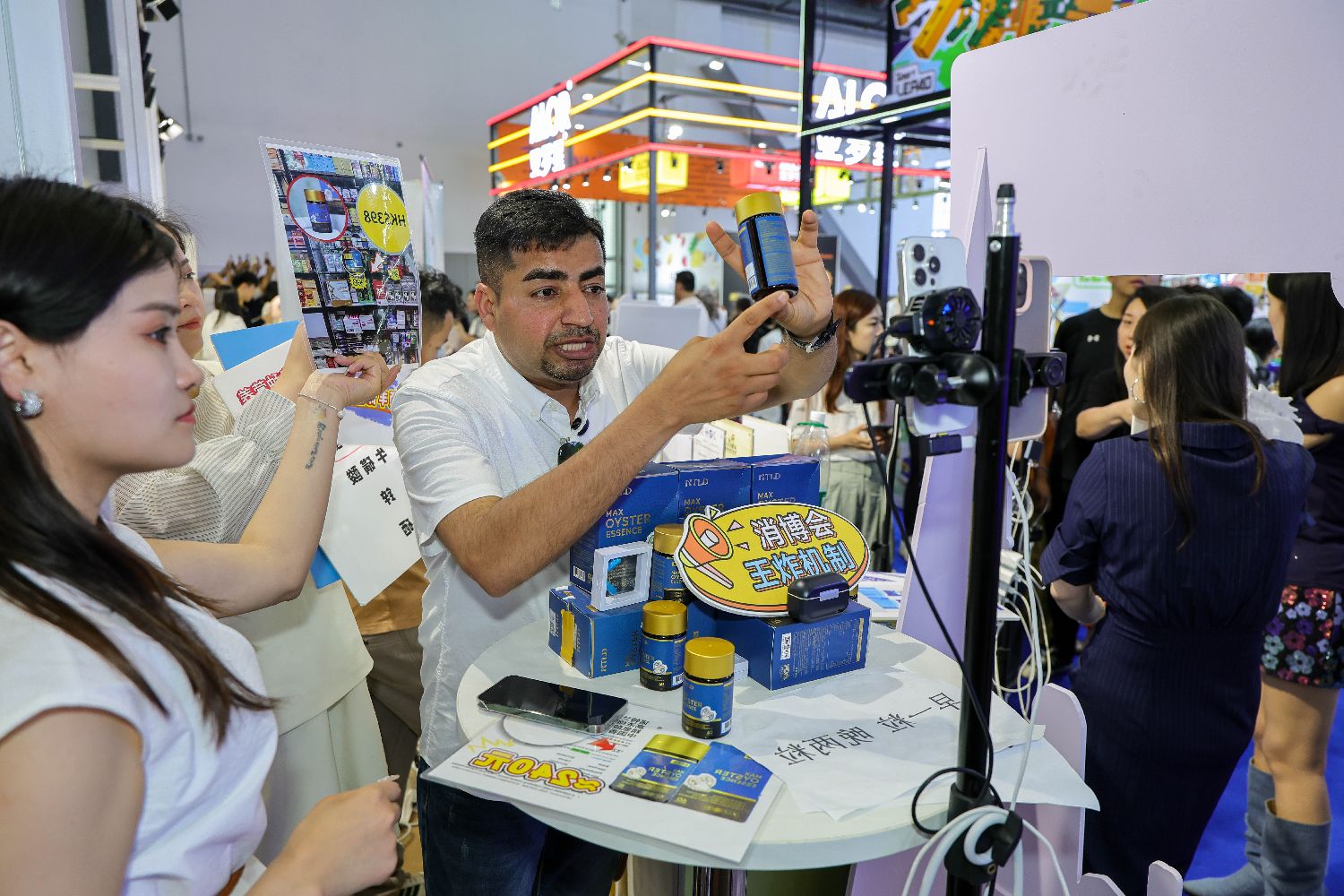 2025年4月17日,第五届中国国际消费品博览会上,来自巴基斯坦的“洋”主播在用中文为网友介绍商品。(图片来源:中新社)